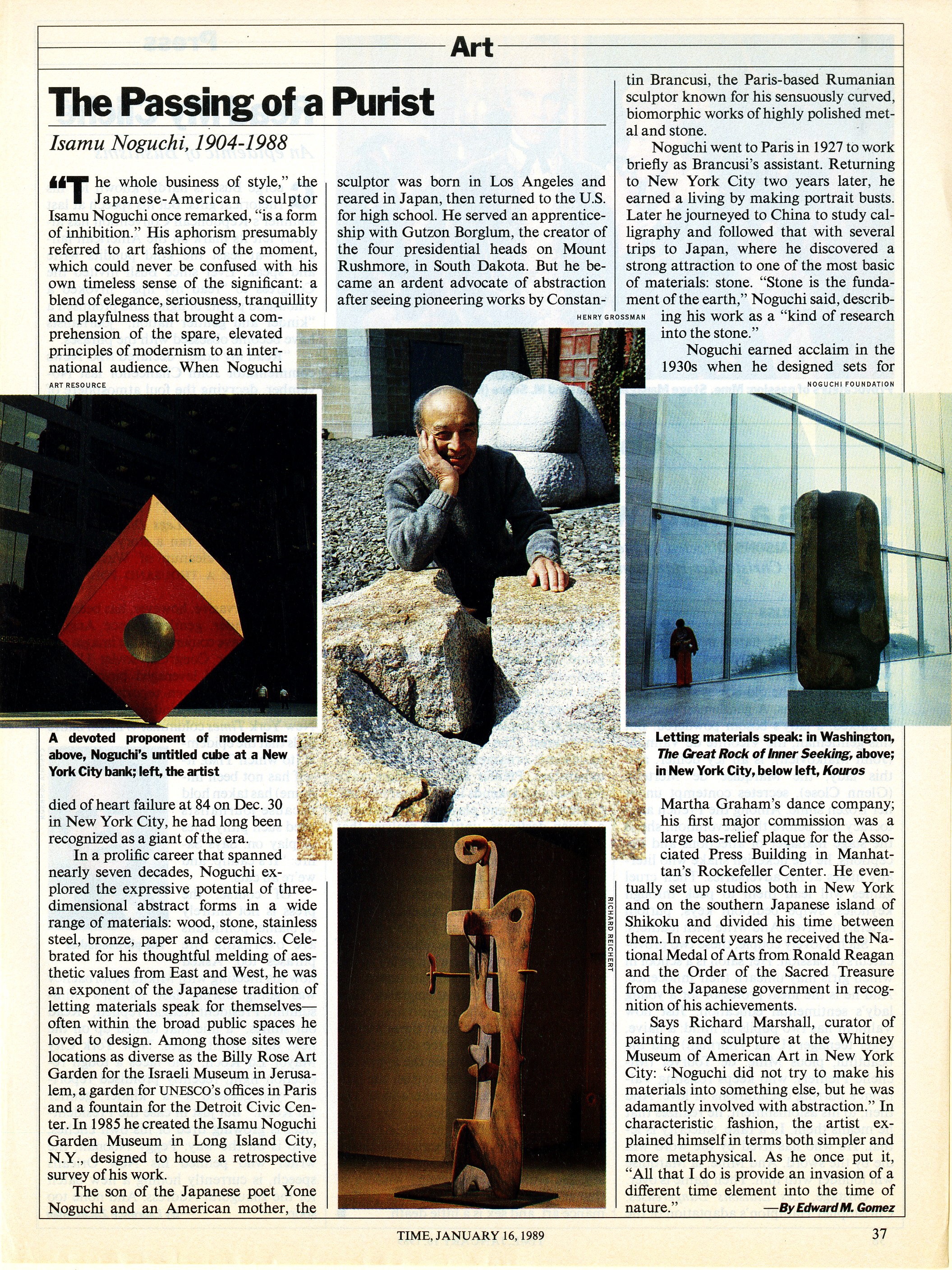 “Art: The Passing of a Purist, Isamu Noguchi, 1904-1988,” TIME International, Asia-Pacific edition, Jan. 16, 1989, page 37. Click here to open a PDF containing this complete article. |