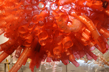 About her art and sources of inspiration, Robson told me: “There are certain problems I’m interested in helping to solve through my work. One is the plastic debris problem, which is a symptom of a much bigger problem in terms of our collective consciousness as human beings. I hope other artists, designers and architects will [also] recognize the potential of all of the cast-off plastic that is accumulating around us [and] is a big problem in our environment.” She pointed out that plastic trash does not biodegrade; instead, it can take thousands of years for plastic to photodegrade, that is, to decompose with exposure to light. Robson said: “Every piece of plastic that has ever been produced still exists. This fact has influenced my desire to interrupt the waste stream with my work.”