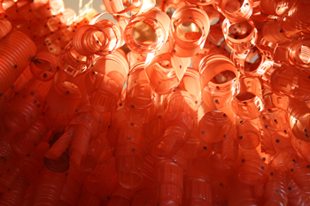 In fact, Robson, who also makes paintings and collages, and is a licensed welder, constructs her sculptures using cast-off plastic bottles, a practice, she notes, that allows her to transform “materials from the waste stream” that would otherwise become trash into objects of beauty and wonder. Technically speaking, by using polyethylene terephthalate (commonly known as “PET”) bottles that are destined for the garbage bin after they have been used to hold water or soft drinks, Robson does not use recycled materials; instead, what she does is rescue materials before they can become waste.