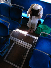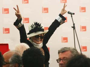 Above, left: Yoko Ono, in white cap and in a blur, fronting the Plastic Ono Band at Royal Festival Hall, London, in a June 14 concert in this year's Meltdown festival. Above, right: Ono in Venice, Italy, on June 6, seconds after receiving the Golden Lion Award for Lifetime Achievement from the organizing committee of the 2009 Venice Biennale. Photos by E.M.G. |