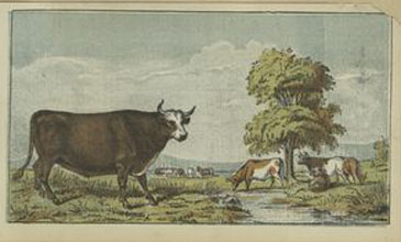 Above, left and right: Chickens and cows living the good life down on the farm, back in the good ol' days before they were made to stand round the clock, cheek to cheek, with no room to move, in their own excrement, in huge sheds with no light (chickens) or in open-air feed lots (cows), and force-fed feed derived from genetically modified corn. Photo on the left: Dated September 1918; photographer unknown; Robert N. Dennis Collection of Stereoscopic Views, New York Public Library Digital Gallery. Photo on the right: Late-19th-century trade card; New York Public Library Digital Gallery. |
