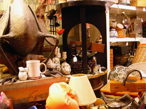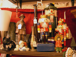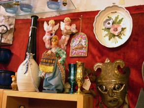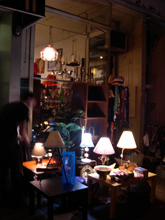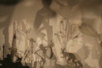 Above, left and right: Shadow Play, a mixed-media installation work by the German artist Hans-Peter Feldmann, on view in the "Making Worlds" exhibition at the 2009 Venice Biennale. In this work, shadows cast on a wall by toys, tools and household objects illuminated by simple lamps as they spin around on rotating discs overlap and create random patterns and an enchanting atmosphere. Photos by E.M.G. |