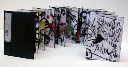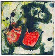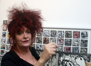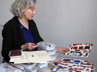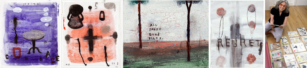 Above, left to right, recent works by Stephanie Brody-Lederman, including: Faire Courage (Blue Table) and Pink Cross, both dated 2010, both made with Sennelier inks on embossed glassine, mounted on paper, dimensions of both works 11 inches x 9 5/8 inches; All Those Good Years, 2012, 8 inches x 10 inches, acrylic and graphite on paper; and Regrets, 2012, acrylic and graphite on paper, 8 5/8 inches x 6 5/8 inches. Far right: The artist in her studio in New York, summer 2012. Photos of artworks by Bill Orcutt, courtesy of Stephanie Brody-Lederman Studio. Photo of the artist by E.M.G. |
