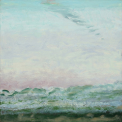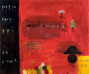 Her pictures, with their hints of anxiety, romance, trepidation or longing, are more impressionistic portraits of uncertain psychic atmospheres than realistic depictions of places or events. Appearing in her works in various media, her simple, poetic-declarative word fragments (“Spoonfuls of the old country” or “Fireflies and candlelit dinners” or “You’re winging it/From shore to forest”) can sound as goofy as they can disjointed.