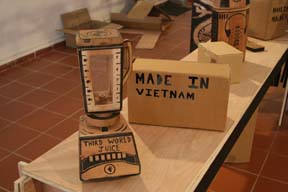 Above: Globalization Factory, a mixed-media work by the Havana-based, Cuban artist Abel Barroso (right). The theme of this year's Havana Biennial is "integration and resistance in the global era." With humor and clever craftsmanship, Barroso's work examines Cuba's technological isolation in the world today. Photos by E.M.G. |