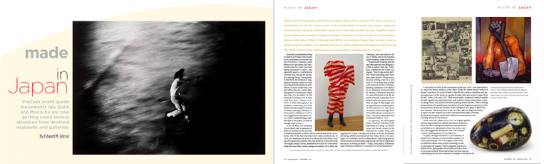 Above: Page spreads from my just-published article about Japanese modern-art exhibitions that are being presented in Japan, the United States and Europe, in the November 2012 issue of Art & Antiques magazine (U.S.A.). Click here to open a PDF containing this article as it appears in print. |