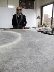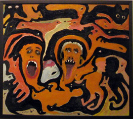 Above, left to right. Poster for Gutai exhibition, now on view at National Art Center, Tokyo; front of the National Art Center, Tokyo; Gutai artist Kazuo Shiraga creating "Challenging Mud," a performance work, at the "First Gutai Art Exhibition," which as held at Ohara Kaikan in Tokyo, in 1955. First two photos by E.M.G.; third photo courtesy of McCaffrey Fine Art, New York, from gallery's website. Photo below, left: Painting by Kazuo Shiraga: Funryū (Jet Stream), 1973, alkyd paint on canvas,182 cm x 210 cm / 71.65 in. x 82.67 in. Photo courtesy of McCaffrey Fine Art, New York, from gallery's website. |
