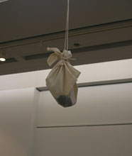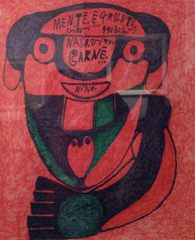 Overall, this year's Biennial offers fewer works of painting and sculpture than it does mixed-media works of a kind that could be described as "conceptualist" or perhaps "wannabe conceptualist." These days, around Latin America, especially in Mexico, a certain strain of what I call gimmick-driven, conceptualist or would-be conceptualist art-making is still very prevalent. Specifically, I'm referring to works whose one-trick plays on the meanings or values of certain appropriated objects or images - frying pans, baskets, cups and saucers, Q-tips, tortillas, supermarket shopping carts, newspaper photos, you name it - purport to provocatively subvert such meanings or values. Many such creations have little or no poetic or aesthetic resonance, however, and after a viewer "gets it" - the new meaning of a stack of dishes or an assemblage of dry tortillas or a familiar corporate or brand logo presented in an uncommon context - there is often little to go back and "get" again.