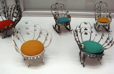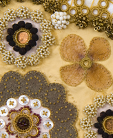 To create these works, Sharrett used the bead-like, round, metal ends of her late, musician brother’s guitar strings and string ends from dozens of other musicians who donated them to her. Her new works also allude to music because they take their titles from actual songs. Admirers of Sharrett’s art gave her articles of clothing (denim jeans, men’s cravats) and antique-damask linens, which she incorporated into these new works. All of these elements, the artist notes, “actually contain memories,” for before she acquired them, they all really had been used by their former owners. Now they serve, like Proust’s pastry, as both “placeholders for memories,” as Sharrett says, and as talisman-souvenirs to provoke them.