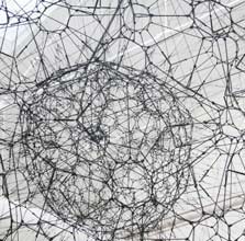 Above, left: A section of the Arsenale, the former ship-building center that houses a large portion of the 2009 Venice Biennale; above, center and right: the Argentine artist Tomas Saraceno's work, made of elasticized string, Galaxies Forming Along Filaments, Like Droplets Along the Strands of a Spider’s Web. Photos by E.M.G. |