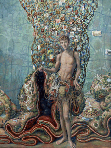 The Weight of Memory 1 (2007), a digital photographic print on vinyl-canvas by Erika Meza Gómez of Paraguay and Javier López Balboa, a Cuban who lives in Paraguay: Meza Gómez and López Balboa's large photo, measuring three meters in width by 4.5 meters in height, shows a bare-breasted Guaraní woman wearing a bead necklace from which numerous computer-memory sticks dangle like big, unlikely lucky charms. One of the more widespread, indigenous peoples of South America, the Guaraní can be found in a settlement area that stretches into what are now parts of Paraguay, Argentina, Uruguay, Bolivia and southern Brazil. Targeted for the slave trade centuries ago during the Spanish-colonial period, they have long faced persecution, especially in Paraguay. Meza Gómez and López Balboa's photographic image alludes to memory as the recorder and storehouse of a society's past, however painful it might be, and also to the power of both individual and collective memory to withstand the efforts of governments or powerful institutions to suppress or even wipe out a people's history, culture or existence. Posted by E.M.G. |