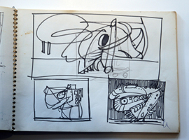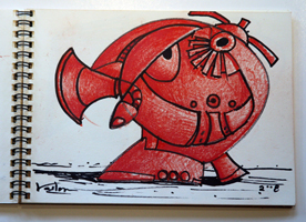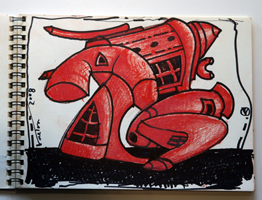 Above, top: A small-scale sculpture made of felt by the Japanese artist Mariko Suzuki, of the kind she uses to illustrate children's stories. Now based in New York, Suzuki works for the internationally known artist Jeff Koons; in her own art-making, in addition to her felt sculptures, she also creates drawings of imaginary worlds that are based on her dreams. See a detail of one such work immediately above. Photos by E.M.G.