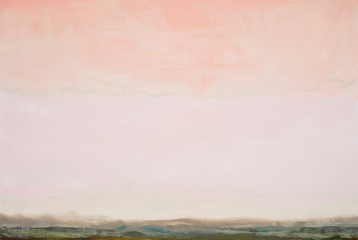Works on view in “Pour” include Roland Flexner’s small (each about the size of about three playing cards), black-and-white abstractions on paper made with liquid graphite, which the artist pushes around his surface by blowing on it through a drinking straw. The resulting compositions resemble surreal landscapes or frothy cascades, and their rich tones are as vivid as the sharp gradations of grays and blacks in fine photographic prints. In works like Jolly Rancher (2012), made with acrylic and graphite on canvas, Carrie Moyer offers big, bright bon-bons marked by dynamic plays of overlapping layers of color and of shape-defining, drawn lines against the hard edges of solid, colored forms. Using oil paint and mica on linen, Jackie Saccoccio creates surfaces with a luxurious sheen; her compositions feature blob-like forms that seem to break up into nets of interwoven lines of drippy color or, conversely, thickets of drippy filaments that gather and congeal into formless forms that float on or near the top layer of a multilayered pictorial space. An enthusiastic colorist, Carolanna Parlato uses acrylic on linen or canvas—assorted pinks, lemon and pastel yellows, fiery orange, acid greens and more—in some of the exhibition’s most vivid examples of the paint-pouring method. Elegant and ecstatic, her paintings seem to revel in their exploration of a very liquid paint’s shiny, viscous goo.