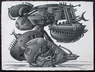 refined his stencil-painting technique. Now he uses acrylic modeling paste and enamel paint with his stencils to create the thick, crusty outlines of